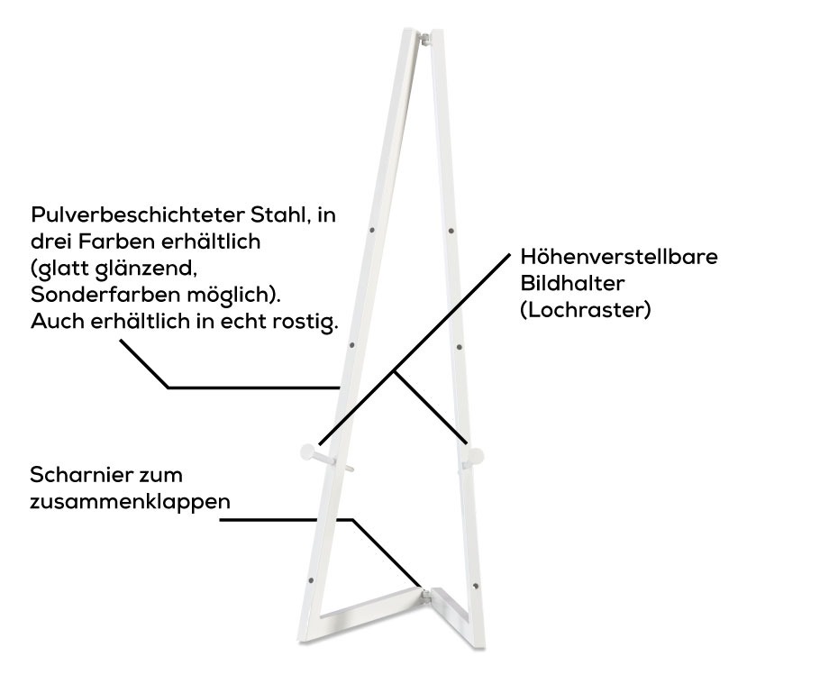Exhibit description The classic made of steel - rock solid & indestructible High-quality aluminium easel with sophisticated details Steel easel can be used on both sides